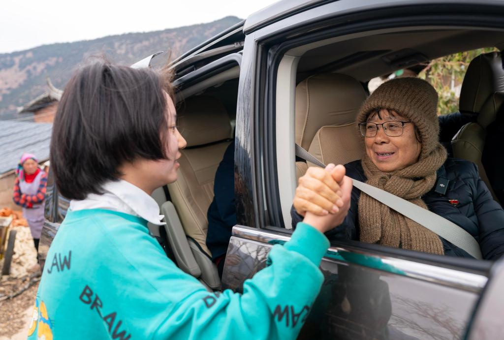 2月6日,在云南省丽江市宁蒗彝族自治县一名学生(左)家中家访结束后,张桂梅在临别之际鼓励学生好好学习。