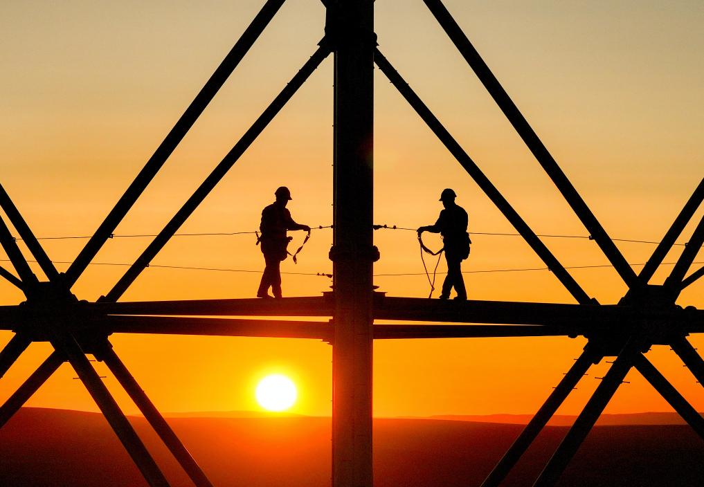 4月17日,工人在张北—胜利1000千伏特高压输电交流项目工程内蒙古段进行组塔作业。