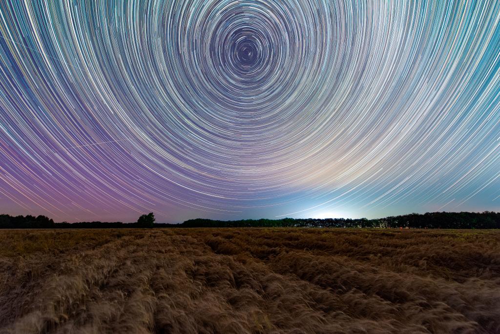 7月30日在黑龙江省富锦市上街基镇万有村拍摄的星空下的麦田(堆栈合成照片)。