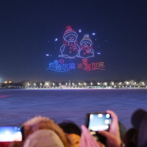 12月6日,人们在哈尔滨市人民防洪胜利纪念塔附近观看无人机光影秀。