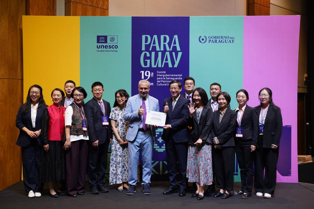 12月5日,在巴拉圭亚松森举行的联合国教科文组织保护非物质文化遗产政府间委员会第19届常会现场,中国代表上台领取证书。(新华社记者 朱雨博 摄)