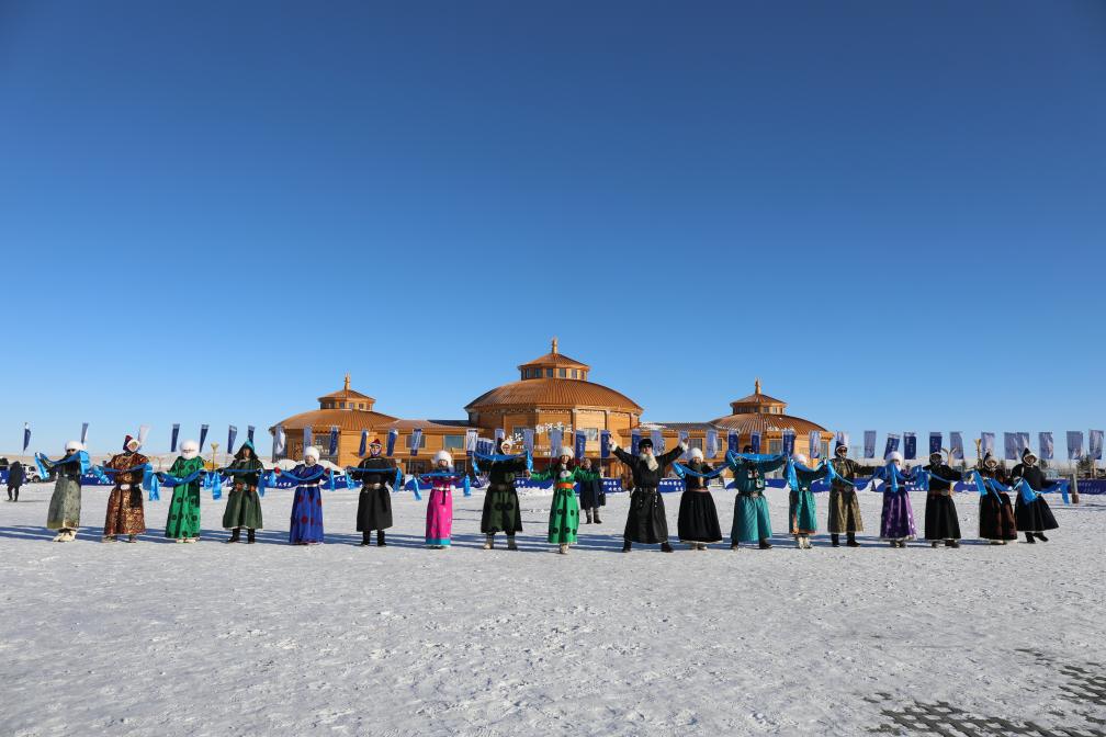 呼伦贝尔大草原·莫尔格勒河景区内,天天冰雪那达慕的演员们盛装打扮,载歌载舞。(陈巴尔虎旗融媒体中心供图)