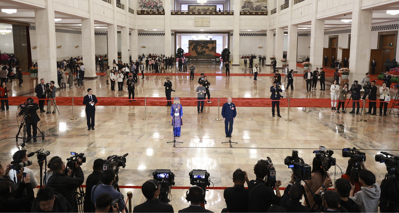 - 5日上午8时许,人民大会堂中央大厅北侧,十四届全国人大二次会议首场“代表通道”开启。6位全国人大代表面对中外记者,分享追梦故事,畅谈履职心声,传递信心力量。