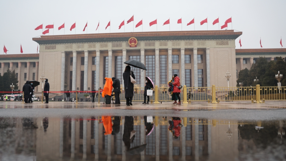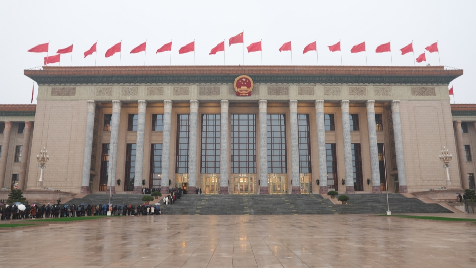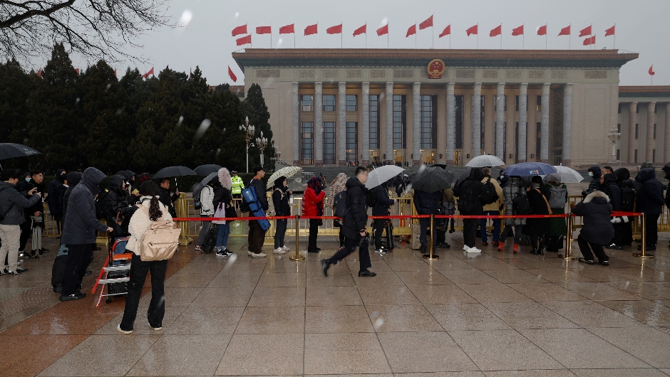 记者冒着雨雪排队等待进入人民大会堂