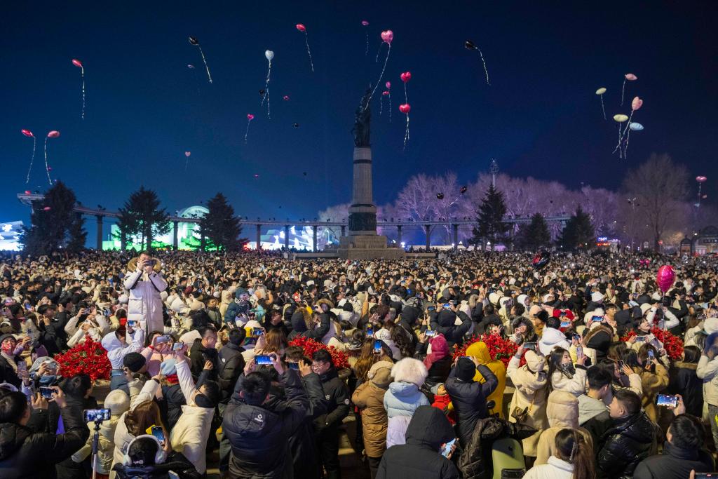 2025年1月1日凌晨,在哈尔滨市防洪纪念塔附近,人们放飞气球迎接新年。新华社记者 谢剑飞 摄