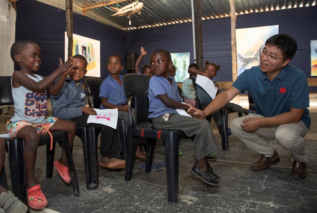 2024年11月20日,中国第16批援纳米比亚医疗队队长黄钦为贫民区的孩子进行卫生习惯教育。(受访者供图)