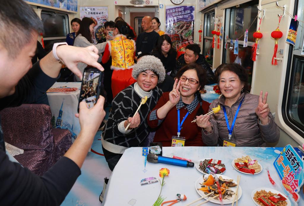 新雪季,从哈尔滨东站出发的Y685次“福鹿雪国号”旅游列车乘务人员将餐车以冰雪为主题进行装饰,并准备了歌舞文艺节目,为“银发族”旅客提供舒适温馨之旅。