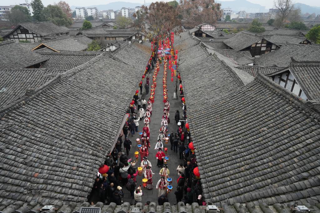 古城中的非遗展演及民俗巡游队伍。新华社记者薛晨 摄