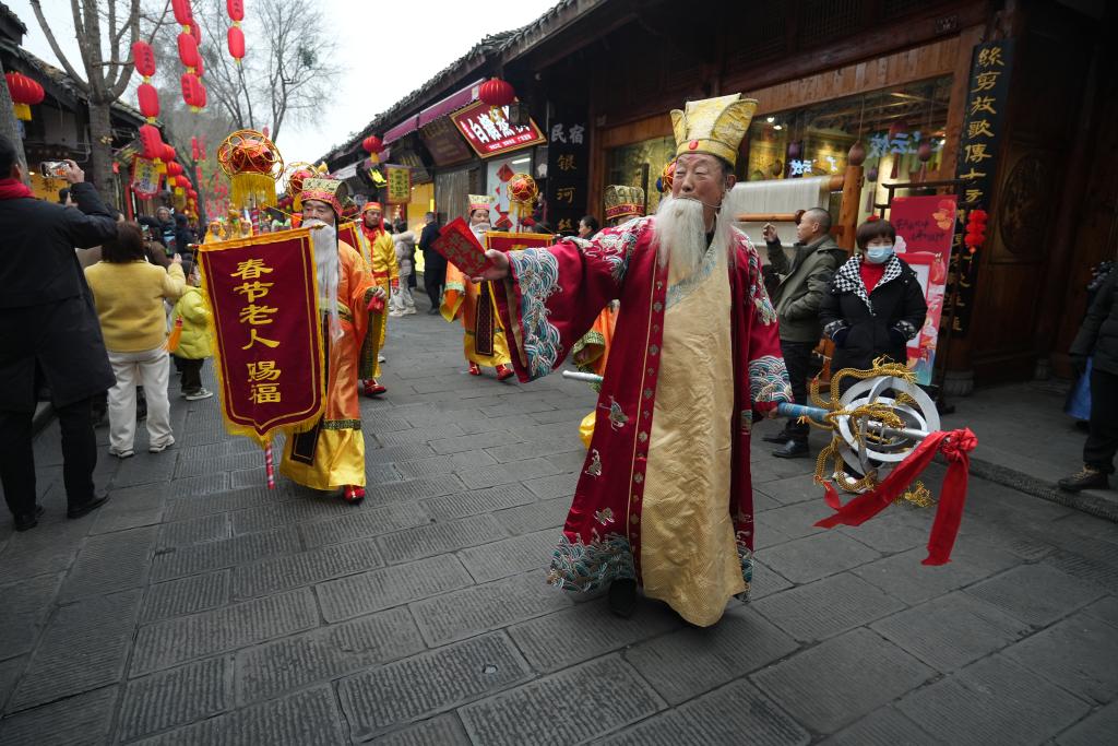 “春节老人”在古城内派发红包。新华社记者薛晨 摄