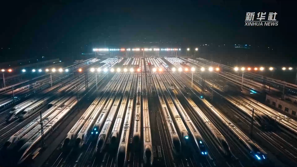 2025年春运将于1月14日拉开序幕,中国铁路广州局集团有限公司广州动车段动车组集结,“钢铁巨龙”整装待发,迎接春运。