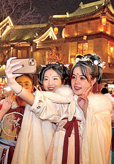 身穿汉服的游客在河南洛阳洛邑古城内拍照。新华社发