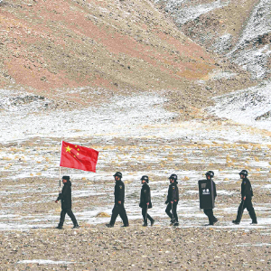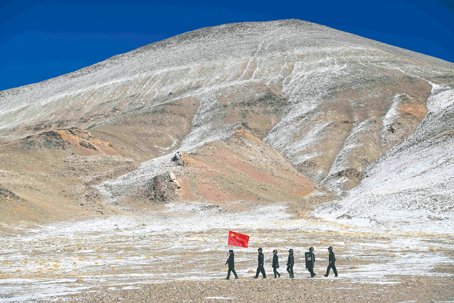 阳光直射,让人难以睁开眼。虽是中午,气温却接近零下20摄氏度。沿途,没有一棵树,远处仅有牦牛在雪原上觅食。路旁就是沿着界碑设立的边境管控设施。国与国的界限,如此具体可感。