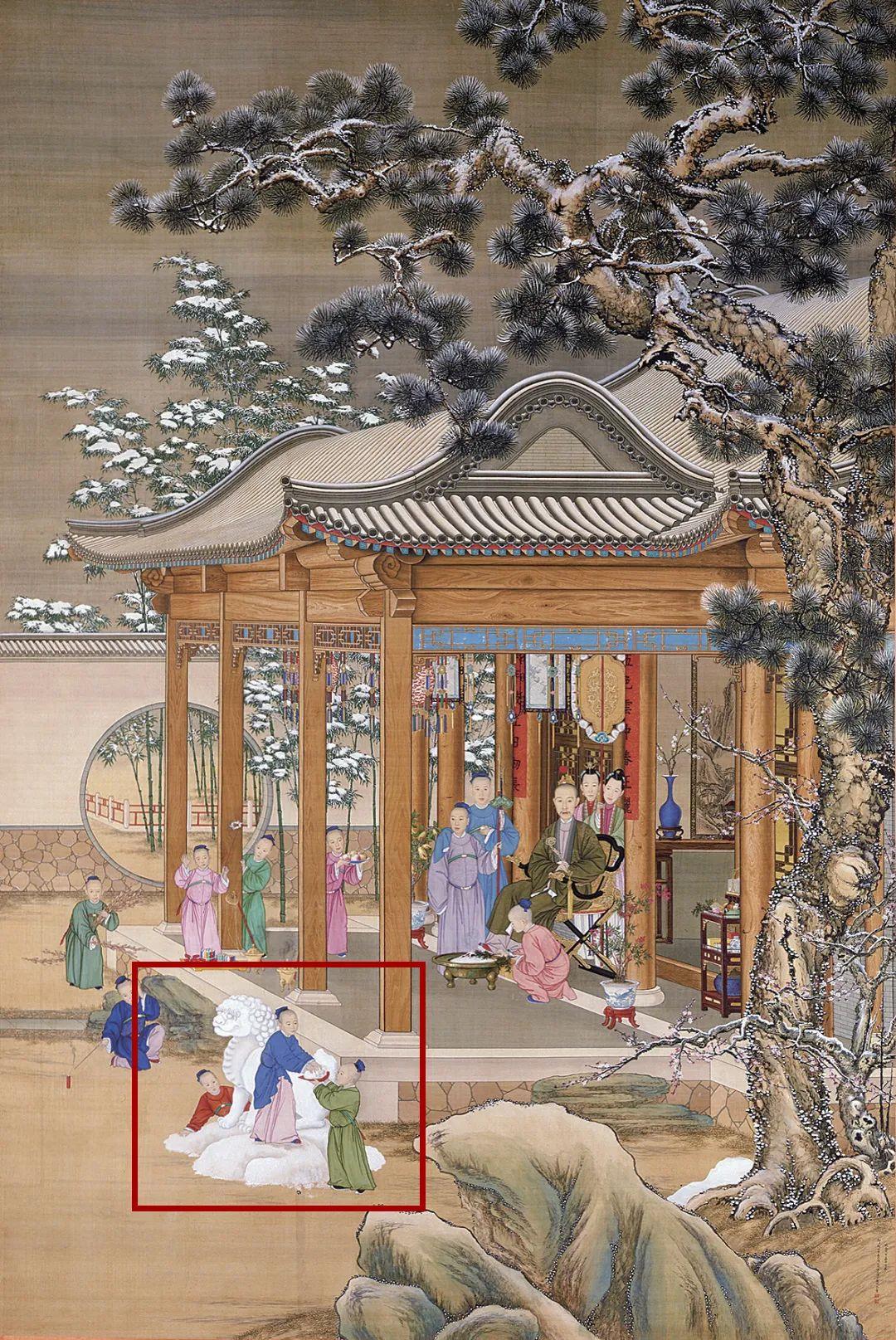 到了南宋,这个传统也延续了下来。《声声慢·催雪》中,这样形容当时女子对堆雪狮的企盼:“彩索金铃,佳人等塑狮儿。”到了清朝,雪狮子的长相可以从画中窥见。