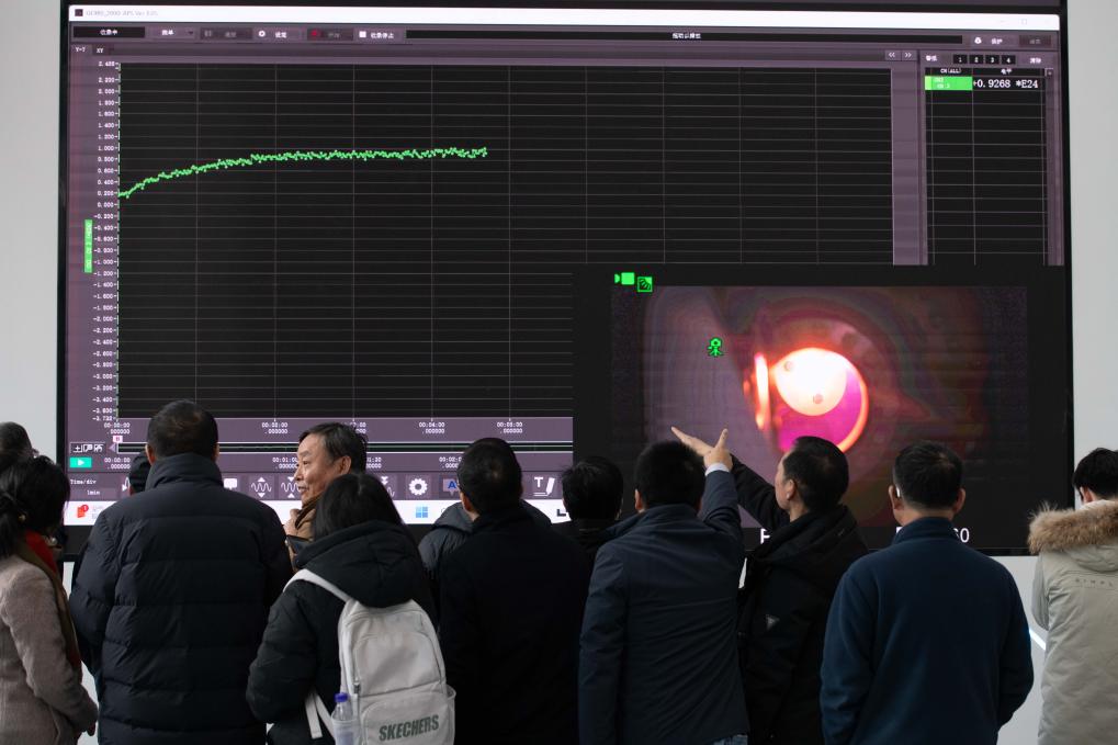 2025年1月14日,在位于安徽省合肥市的聚变堆主机关键系统综合研究设施(CRAFT)园区内,科研人员及专家通过大屏幕了解强流直线等离子体装置“赤霄”的运行状态。新华社记者 张端 摄