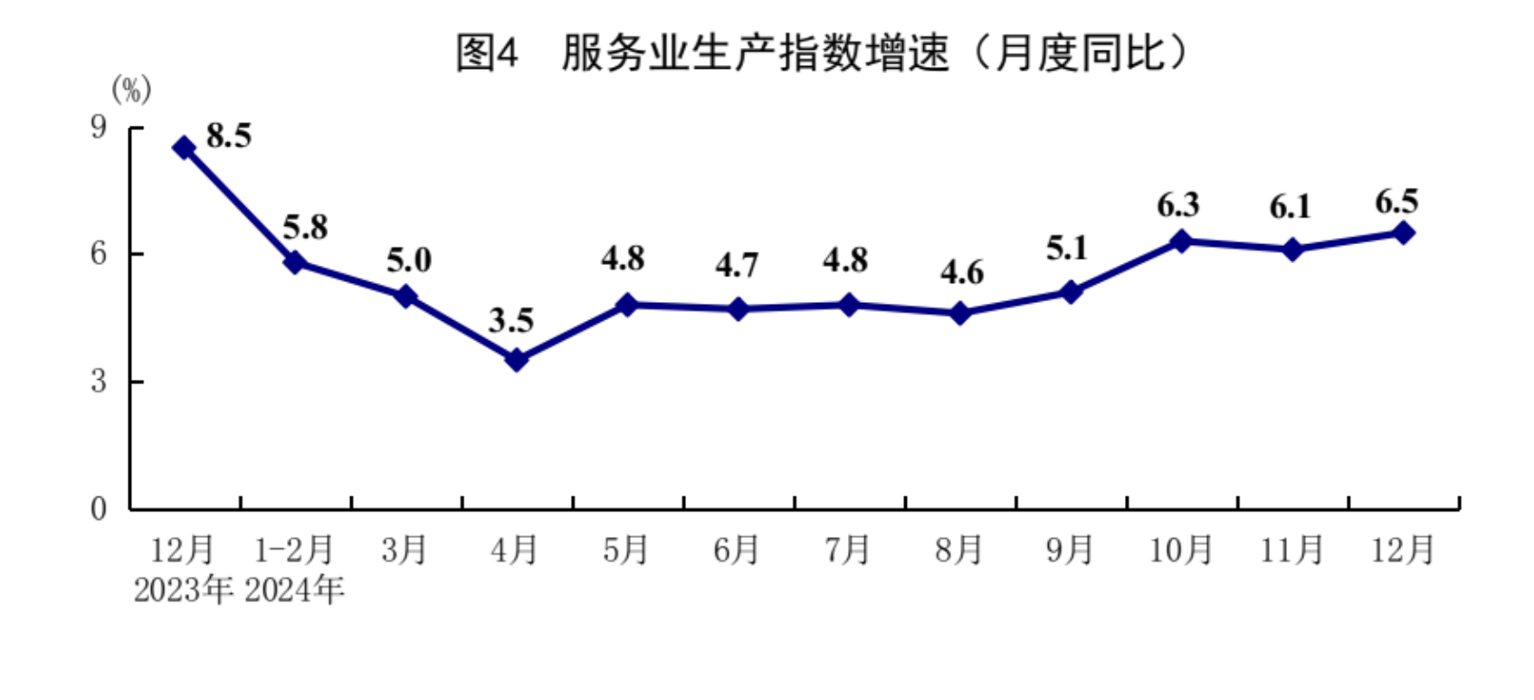 全年服务业增加值比上年增长5.0%。其中,信息传输、软件和信息技术服务业,租赁和商务服务业,交通运输、仓储和邮政业,住宿和餐饮业,金融业,批发和零售业增加值分别增长10.9%、10.4%、7.0%、6.4%、5.6%、5.5%。四季度,服务业增加值同比增长5.8%。12月份,服务业生产指数同比增长6.5%;其中,租赁和商务服务业,金融业,信息传输、软件和信息技术服务业,交通运输、仓储和邮政业生产指数分别增长9.5%、9.3%、8.8%、8.3%。1—11月份,规模以上服务业企业营业收入同比增长8.2%。其中,租赁和商务服务业,信息传输、软件和信息技术服务业,交通运输、仓储和邮政业企业营业收入分别增长11.5%、9.5%、8.3%。