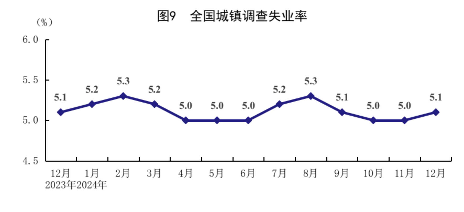 全年全国城镇调查失业率平均值为5.1%,比上年下降0.1个百分点。12月份,全国城镇调查失业率为5.1%。本地户籍劳动力调查失业率为5.3%;外来户籍劳动力调查失业率为4.6%,其中外来农业户籍劳动力调查失业率为4.5%。31个大城市城镇调查失业率为5.0%。全国企业就业人员周平均工作时间为49.0小时。全年农民工总量29973万人,比上年增加220万人,增长0.7%。其中,本地农民工12102万人,增长0.1%;外出农民工17871万人,增长1.2%。