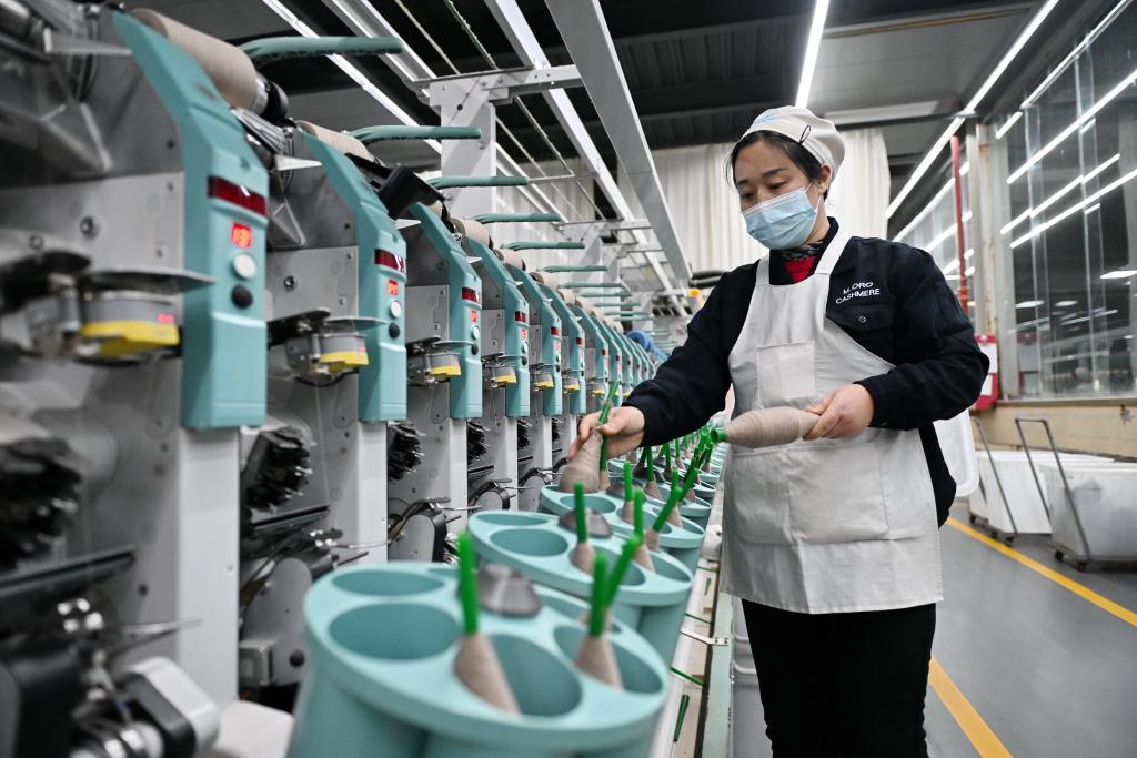 1月18日,河北省邢台市清河县一家羊绒制品生产企业的员工在羊绒纱线生产车间内工作。