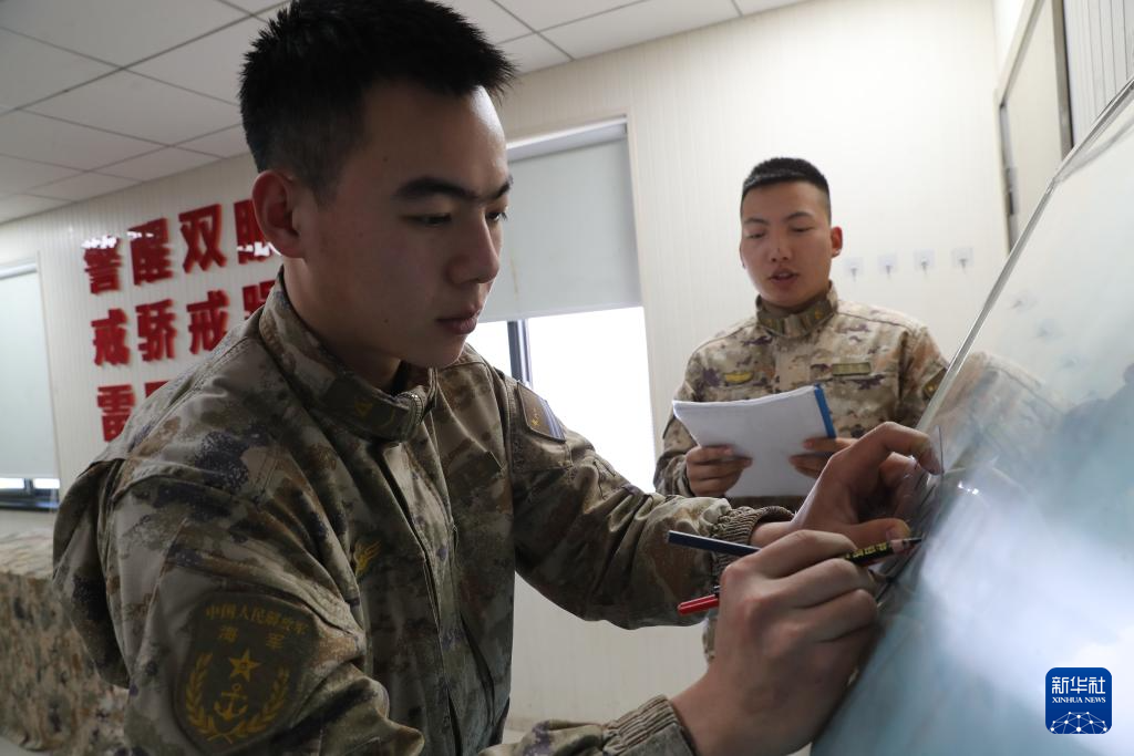 1月18日,东部战区海军某高山雷达站两名战士进行标图训练。新华社发(张容瑢摄)