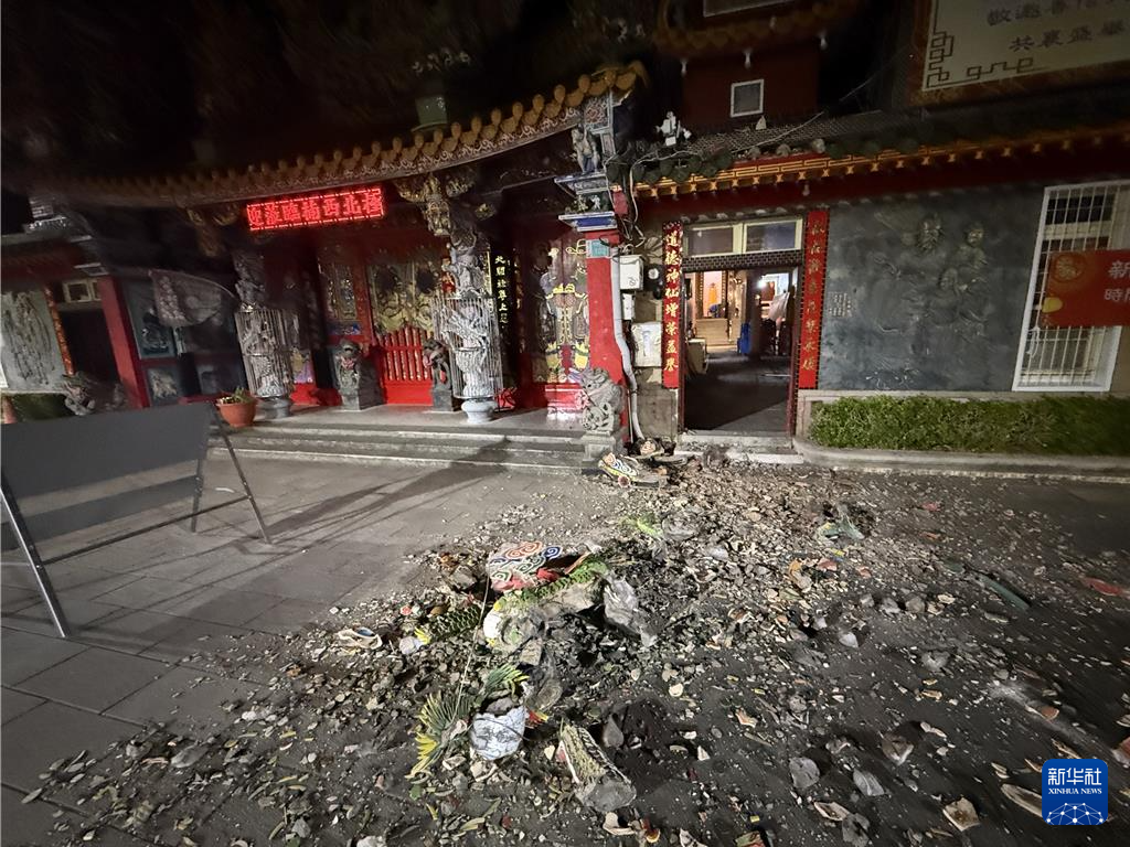 台南市楠西区民族路北极殿麒麟雕像因地震倒塌(1月21日摄)。新华社发(台湾中时新闻网供图)
