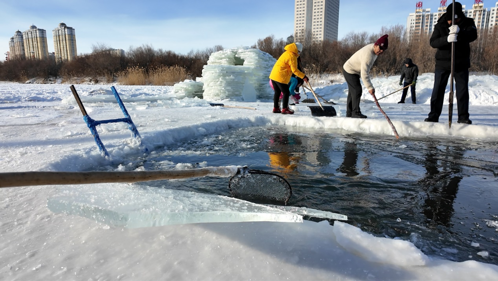这时的河面早已结了厚厚一层冰,但有一块长方形的冰面明显更薄,因为这是他们要冬泳的“泳池”。