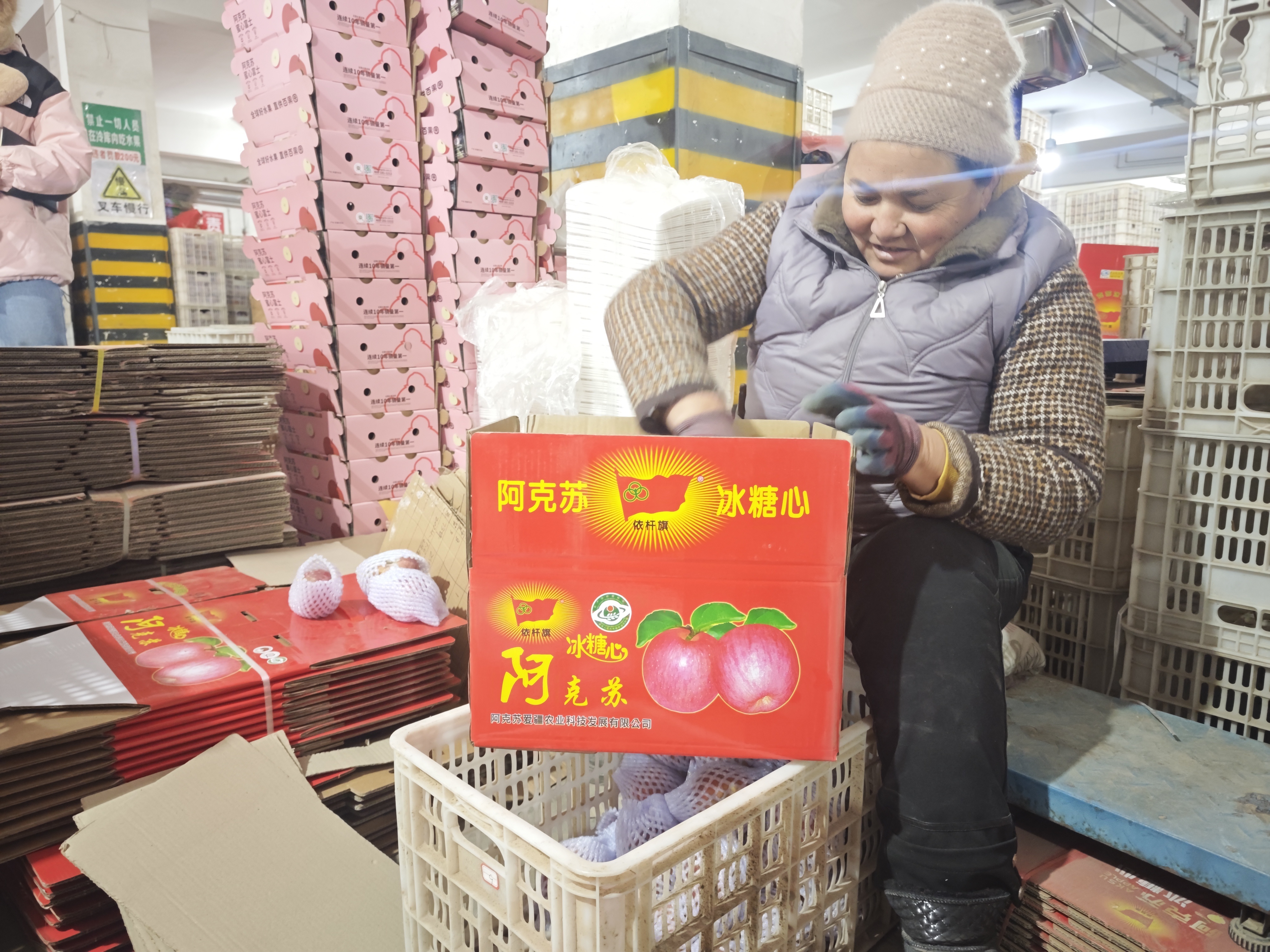 见到吐拉克孜·木坦力普时,她正在阿拉尔市爱疆农业有限公司的果库里给苹果套袋装箱。大红色的纸箱上,“阿克苏冰糖心”几个大字尤为引人注目。打包好的一箱箱苹果码放整齐,被叉车快速运往库房门外装车发货。