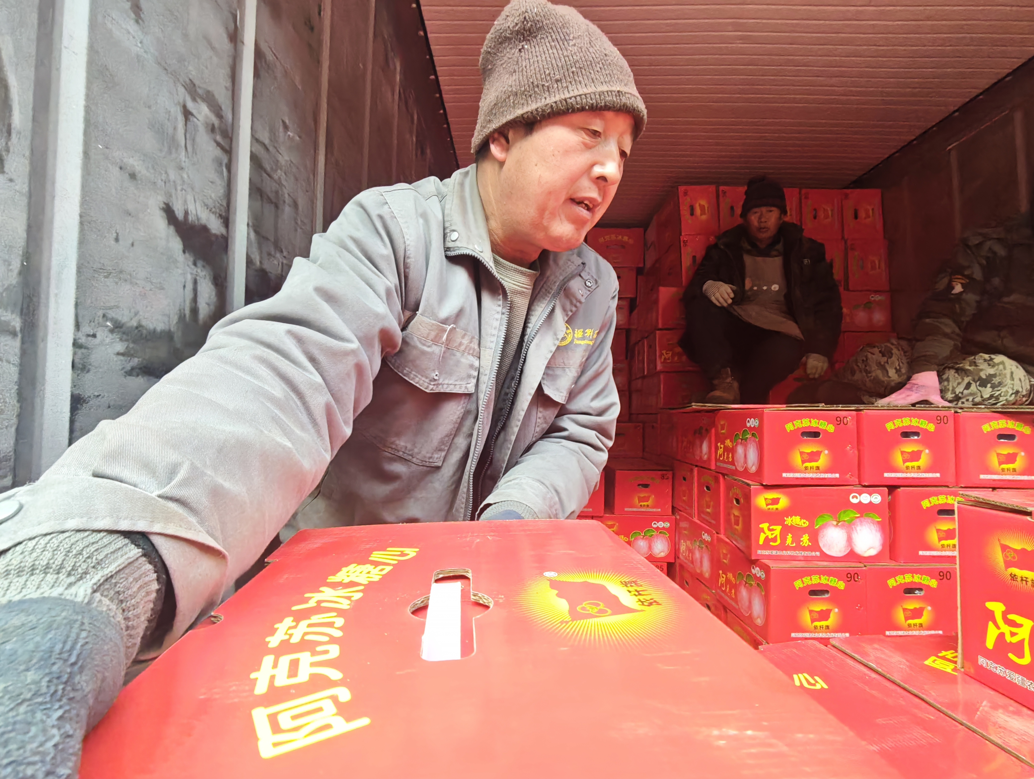 1月16日,阿拉尔市爱疆农业有限公司员工正在装车发运苹果。新华社记者苟立锋 摄