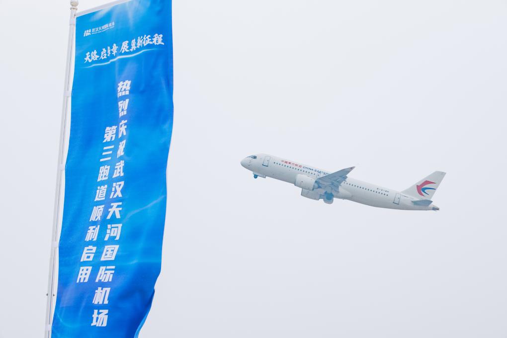 1月23日11时许,由C919飞机执飞的中国东方航空MU5386航班从武汉天河国际机场第三跑道起飞。自此,武汉天河国际机场第三跑道启用,湖北民航服务保障能力得到进一步提升。