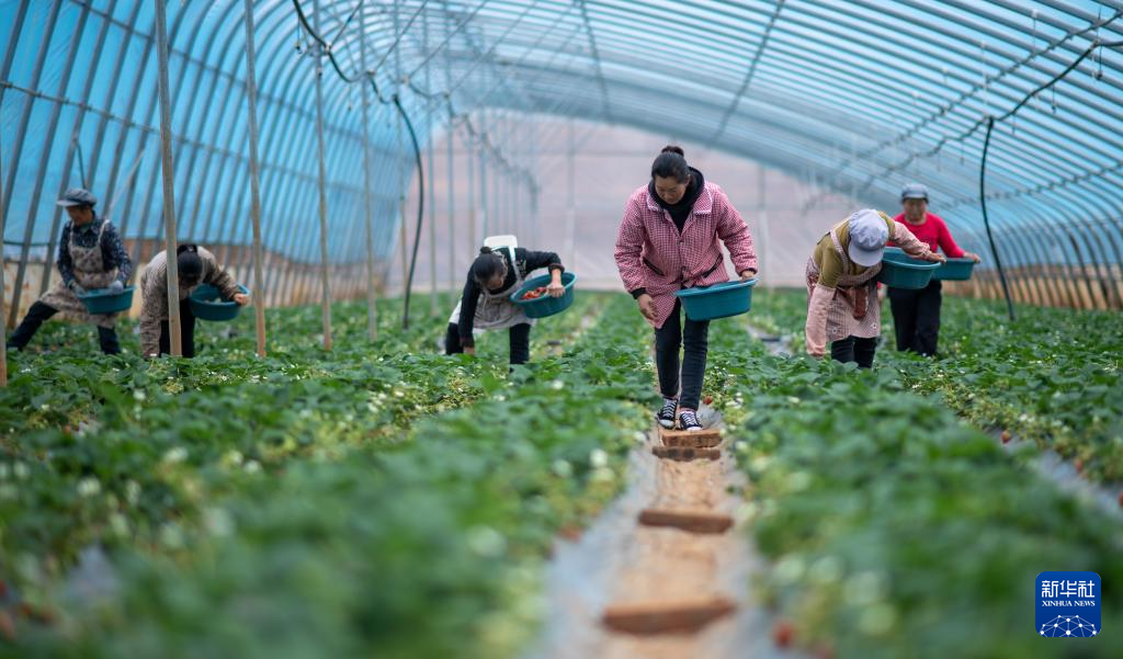 云南省曲靖市会泽县迤车镇迤北村村民在村里的草莓种植基地采摘草莓(1月22日摄)。