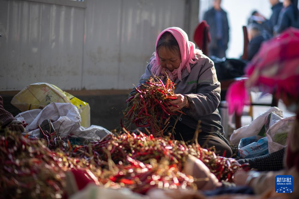 云南省曲靖市会泽县钟屏街道居民在家门口的产业园分拣辣椒(1月21日摄)。