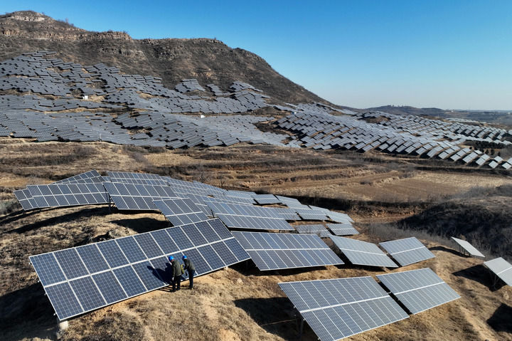 2025年1月19日,国网邢台供电公司的工人在辖区虎头山光伏发电场巡检(无人机照片)。新华社记者 杨世尧 摄