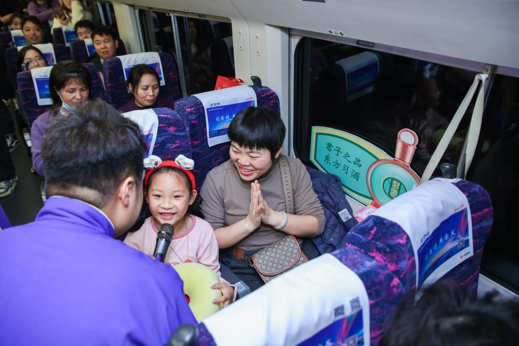 1月23日,工作人员在返乡务工专列上为乘客表演节目。新华社发