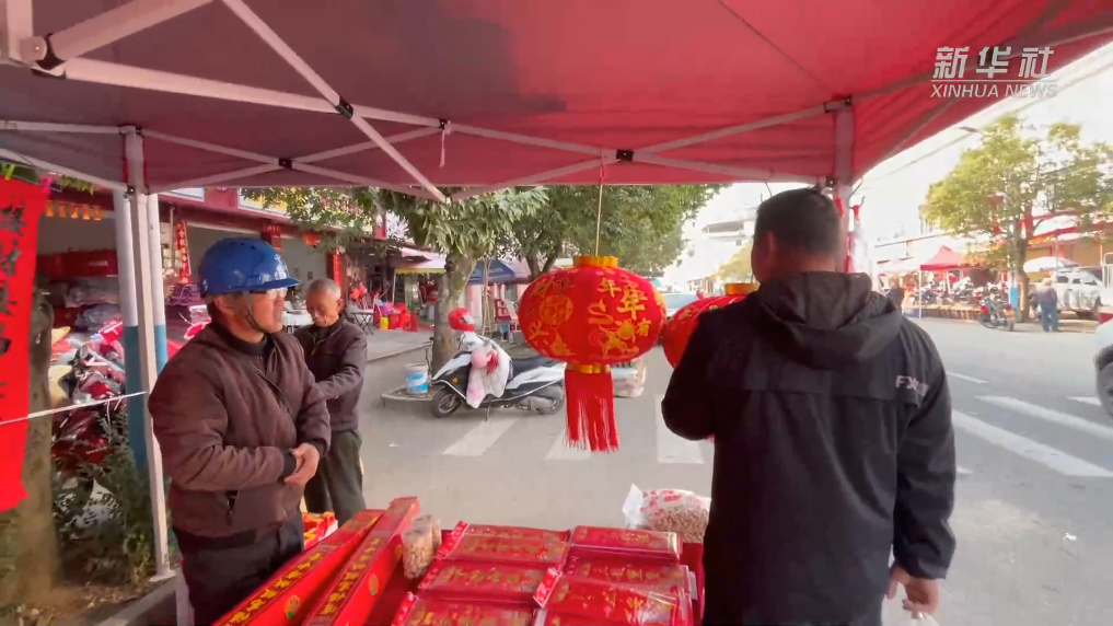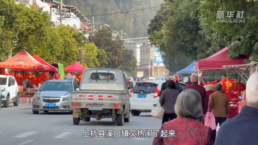 临近春节,溪口镇集市上灯笼高挂,春联鲜艳,叫卖声、谈笑声不绝于耳,呈现出一片红火景象。