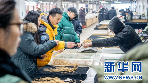 临近春节,吉林省白山市抚松县的长白山人参交易市场内,顾客在选购人参。(1月15日摄)新华社记者 唐成卓 摄