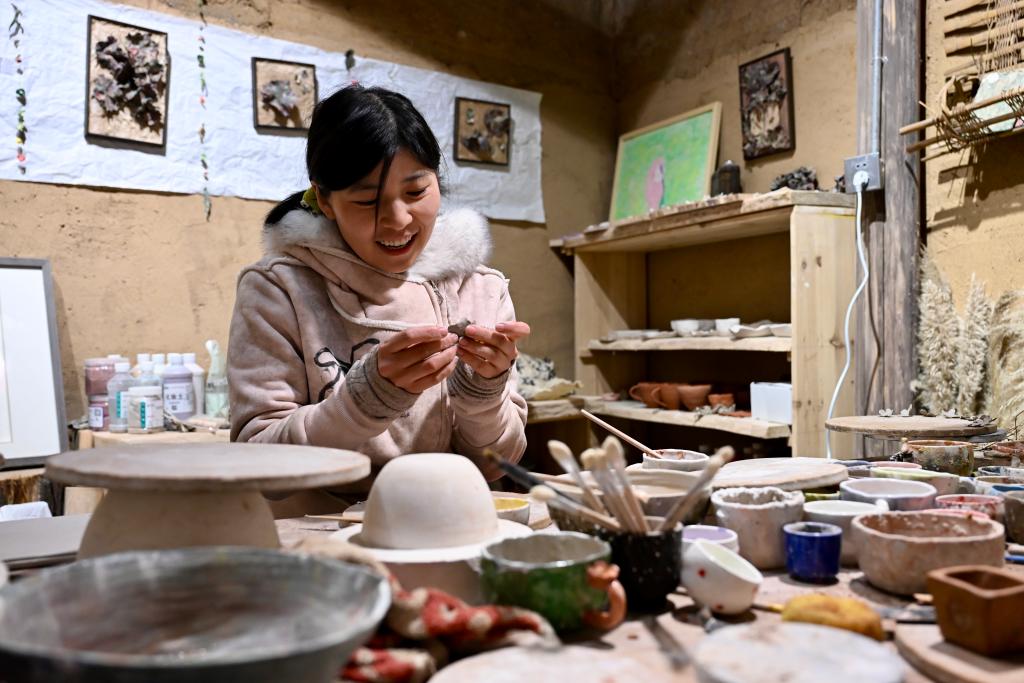 定居松庄村的“80后”设计师何秀花在进行白茶花主题的粘土创作。新华社记者 刘铭翔 摄