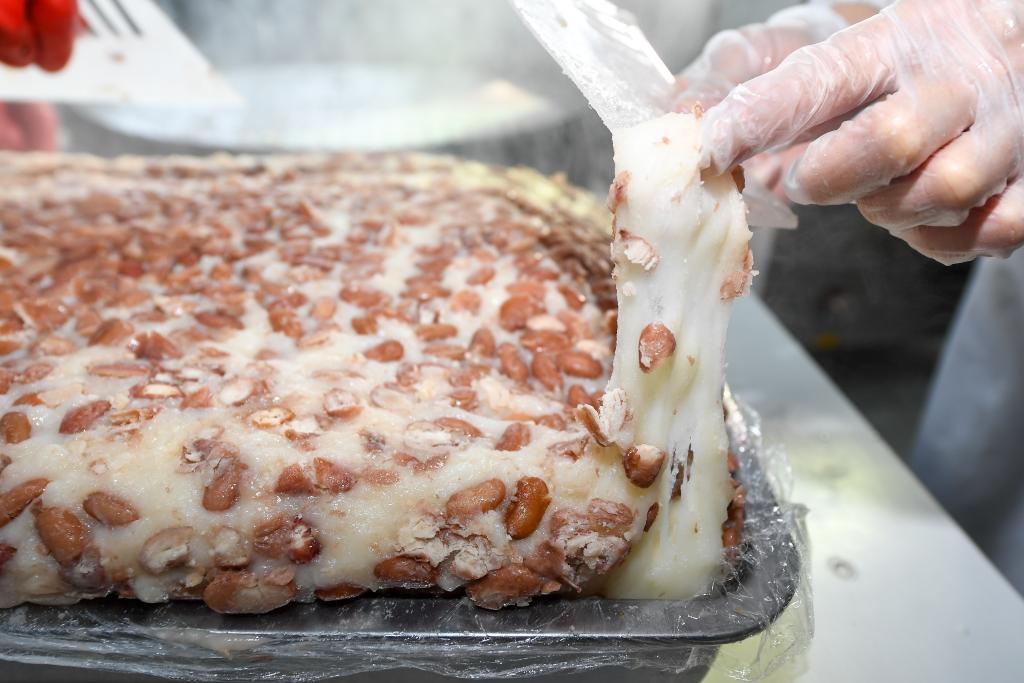 1月6日,工人在位于吉林省公主岭市范家屯镇凤响村的粘豆包厂车间制作年糕。新华社记者 张楠 摄