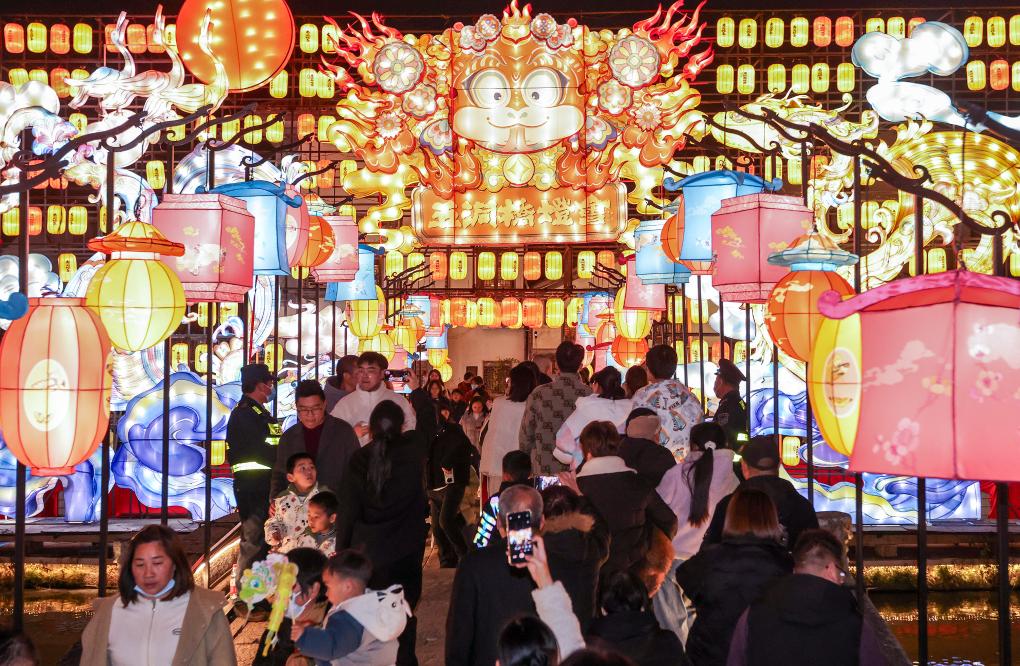 1月24日晚,浙江省台州市黄岩区五洞桥蛇年灯会开灯,吸引了众多市民前来欣赏。新华社发(孙金标摄)