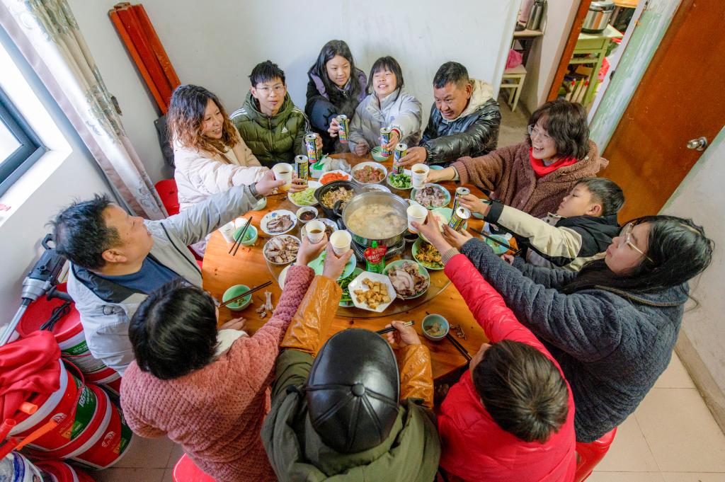 1月28日,在浙江省金华市山后胡村,村民陈方进一家欢聚一堂吃团圆饭。新华社发(胡肖飞摄)