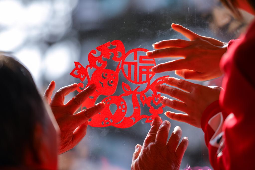 1月24日,在山东省青岛市李沧区颐福养老院举办的迎新春活动中,老年人和工作人员一起贴窗花。新华社发(张鹰摄)