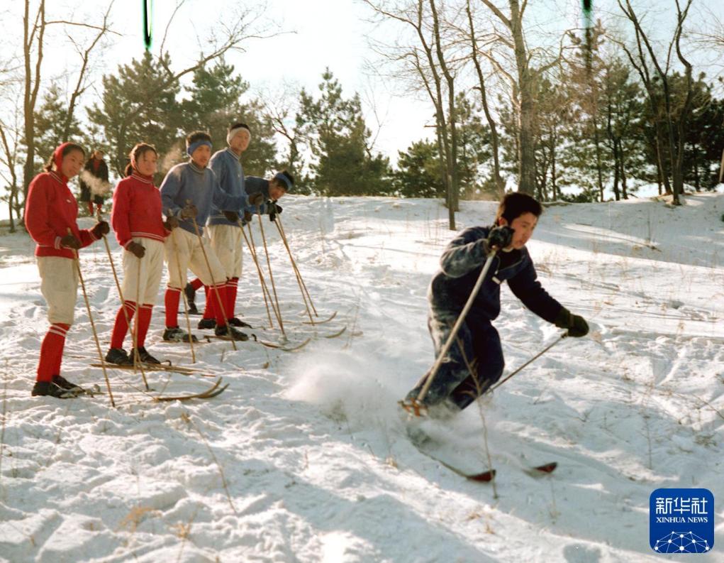1979年寒假期间,吉林市的少年滑雪爱好者来到北山公园雪场上练习滑雪。新华社记者 刘恩泰 摄
