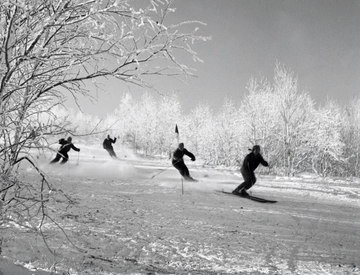 1963年,在内蒙古大兴安岭阿尔山林区,滑雪运动员正在练习大回转滑行技术。 新华社记者 赵连升 摄