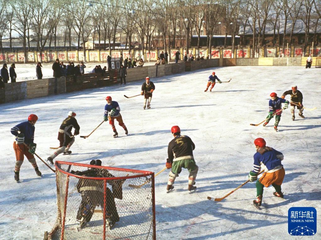 1979年,吉林造纸厂工人冰球队和吉林化工机械厂工人冰球队在比赛。新华社记者 刘恩泰 摄