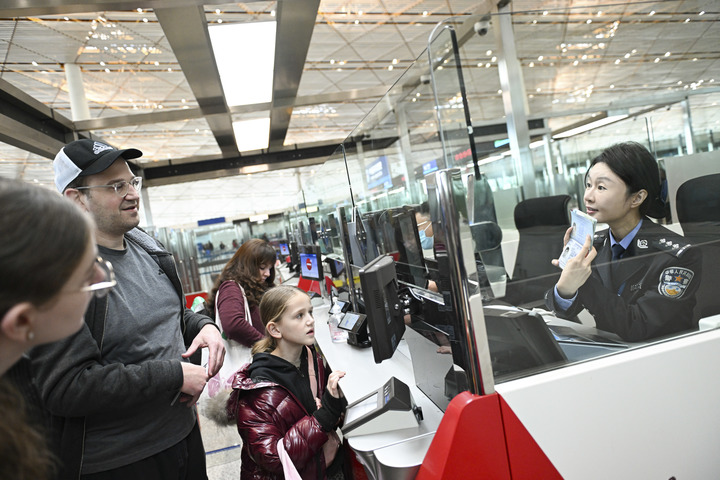 1月28日,边检民警陈苗(右一)为几位美国游客办理过境免签手续。新华社记者 陈钟昊 摄