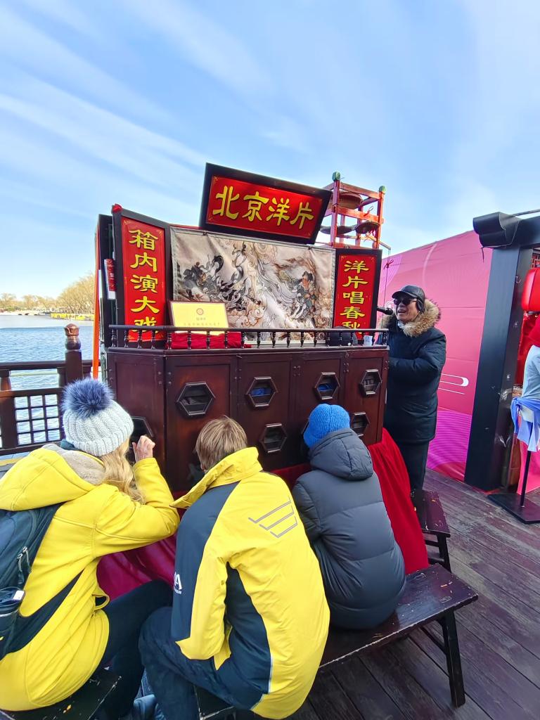 乌尔丽克与埃米尔在什刹海看北京洋片表演。新华社记者于佳欣 摄