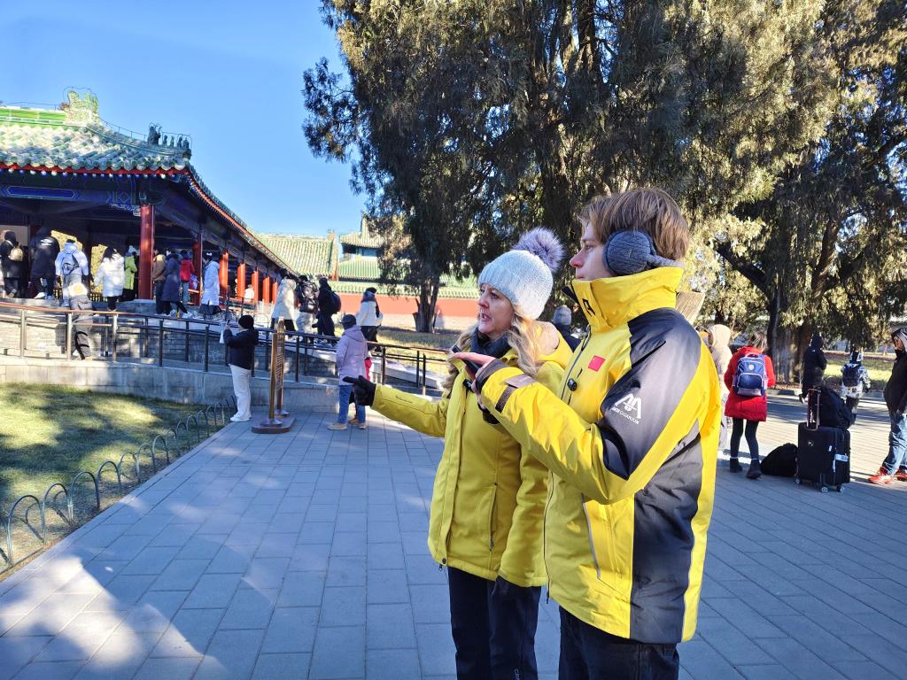 祈年殿、皇穹宇、圜丘……路过一个个景点,记者为他们介绍起建筑背后的历史和“天人合一”理念,母子二人听得津津有味。当天北京户外温度低至零下8摄氏度,手冻得生疼,但丝毫未影响埃米尔和妈妈拍照记录的热情。
