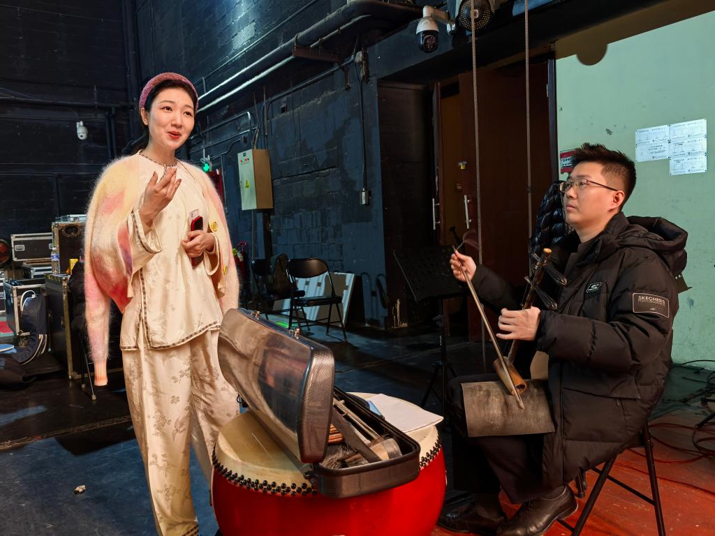 1月31日晚,演员吕耀瑶和琴师冯震宇在后台进行演出前的磨合。新华社记者杨湛菲 摄
