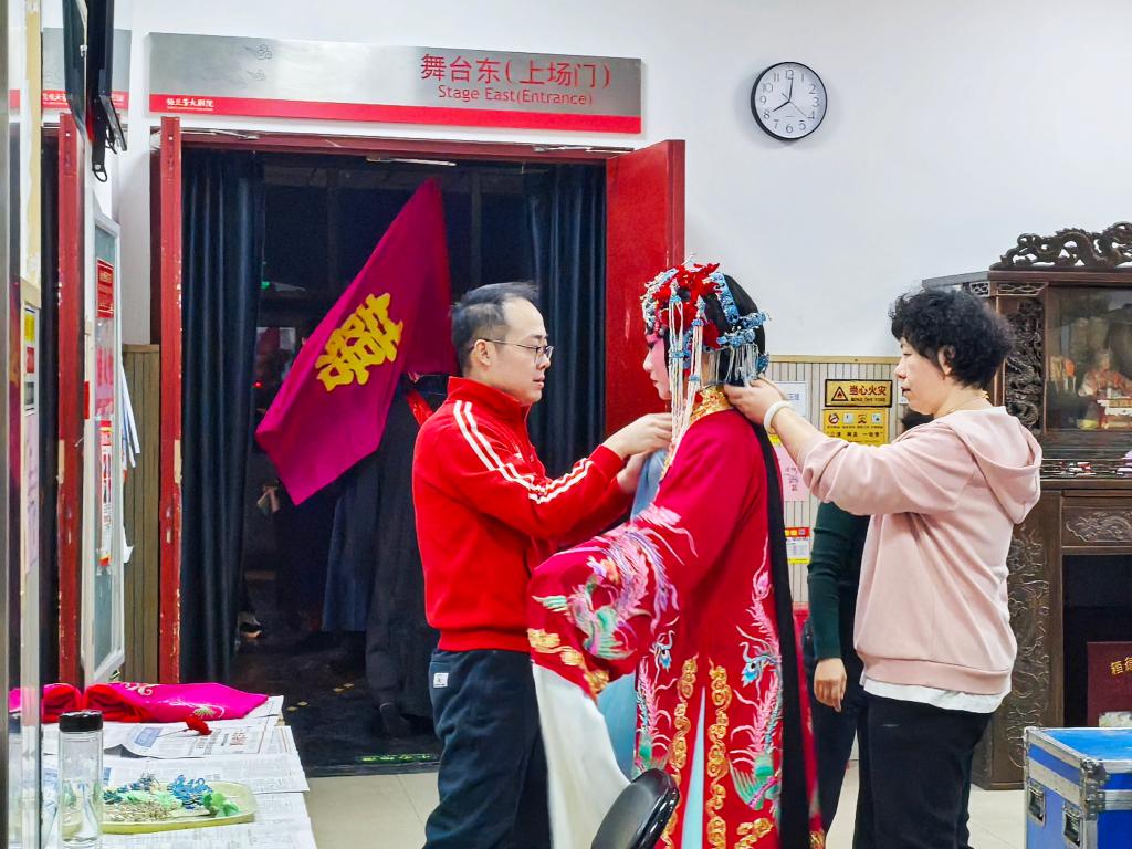 饰演薛湘灵的青年演员吕耀瑶在舞台一侧找到琴师冯震宇,进行演出前的磨合:“咱俩把排练中遇到的问题再碰一下,找找感觉。”