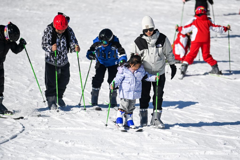 游客在天湖滑雪场体验滑雪