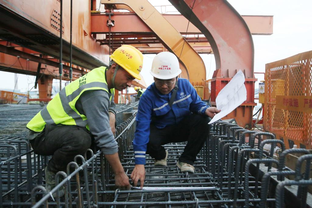 图为吴基坚(右)核对钢筋绑扎参数。 (中铁二十五局供图)