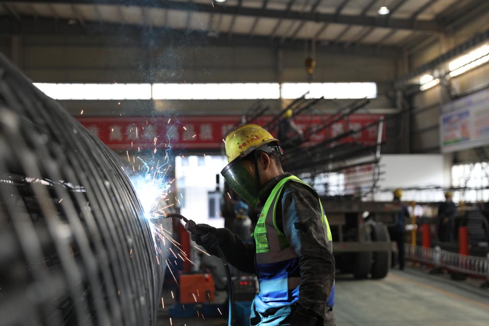图为通苏嘉甬高铁项目施工人员进行钢筋笼焊接。(中铁十六局供图)