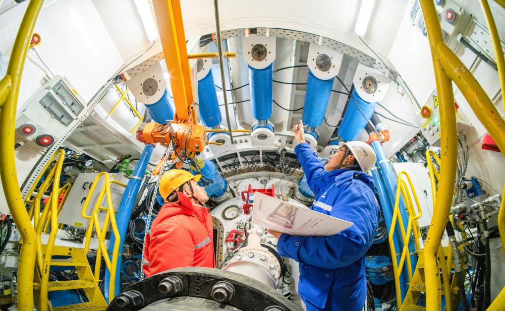 图为盾构机维保人员在检查盾构机液压系统。(中铁十四局供图)